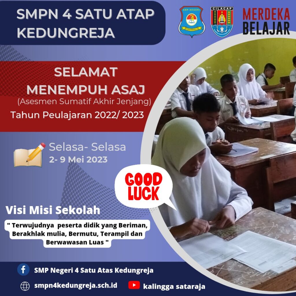 Halo sahabat sataraja dimanapun berada, semoga sehat dan semangat selalu. Berdasarkan dasar Hukum Undang-Undang Nomor 20 Tahun 2003 tentang Sistem Pendidikan Nasional (Lembaran Negara Republik Indonesia Tahun 2003 Nomor 78) dan Peraturan Pemerintah Nomor 57 Tahun 2021 tentang Standar Nasional Pendidikan (Lembaran Negara Republik Indonesia Tahun 2021 Nomor 87) Sebagaimana diubah dengan Peraturan Pemerintah Nomor 4 Tahun 2022 tentang Perubahan Asas Peraturan Pemerintah nomor 57 Tahun 2021 tentang Standar Nasional Pendidikan (Lembaran Negara Republik Indonesia tahun 2022 Nomor 14) maka sekolah kami mengadakan ASAJ (Asesmen Sumatif Akhir Jenjang) Tahun Pelajaran 2022/2023 pada Selasa, 2 Mei 2023 sampai Selasa, 9 Mei 2023 di SMPN 4 Satu Atap Kedungreja Kecamatan Kedungreja Kabupaten Cilacap Pada kelas IX dengan total 70 peserta didik. Bismillah mohon doanya semoga peserta didik kami sukses dalam menempuh ASAJ, Lancar tanpa halangan apapun dalam meniti Asesmen ini.